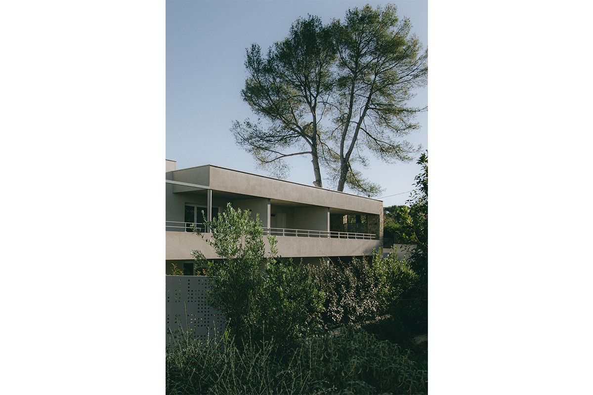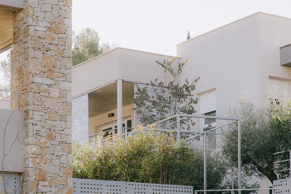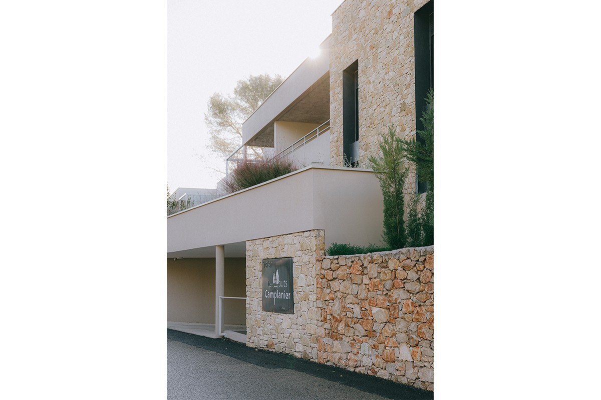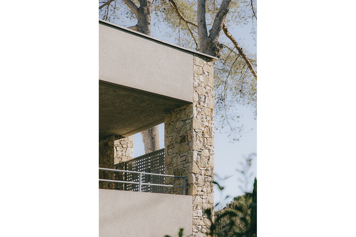 Le projet s’intègre également par sa hauteur limitée au R+1, respectant l’épannelage des habitations voisines, et par le choix de ses matériaux : les façades sont dessinées par un jeu de bandeaux en béton architectonique, d’avancées de pierres sèches et d’enduits clairs, liant l’ensemble du projet dans un langage architectural ancré dans son milieu.